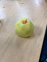 This week is brought to you by the letter A. With playdough we made different things that started with the letter A. You will see an acorn, an apple, an ambulance, an ant and an ant hill.